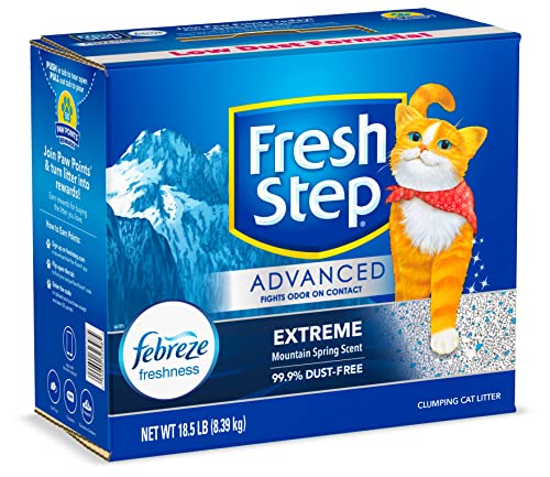 Details: Fresh Step Advanced Extreme clumping cat litter destroys extreme odors with the power of Febreze. It gets rid of the strongest litter box odors with a tough odor eliminating formula and leaves behind a fresh Mountain Spring scent. Fresh Step Advanced Extreme also uses Fresh Step Clumplock Technology, which locks in liquid and odor and creates tight clumps for easy scooping, and prevents stinky crumbles from being left behind. And, it is 99.9% dust free for cleaner surfaces, cleaner air and reduced tracking. Cleaning is fast and easy—just add more litter to your cat’s litter box after you scoop.