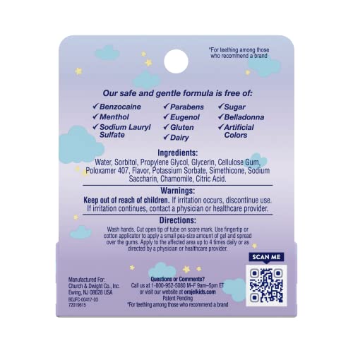 Details: Orajel Baby Drug-Free Nighttime Cooling Gel helps you calm, relax and soothe infants who may be teething, upset, cranky or fussy. Use this special nighttime formula with chamomile at home or away. Safe and gentle, Orajel is the #1 Pediatrician Recommended Brand for Teething*. And if your little one is irritable during the day, try Orajel Baby Daytime Cooling Gel. Orajel has you covered from first tooth to full smile with a full line of fluoride-free and fluoride toothpastes to take your child from teething to independent brushing. *among those who recommend a brand